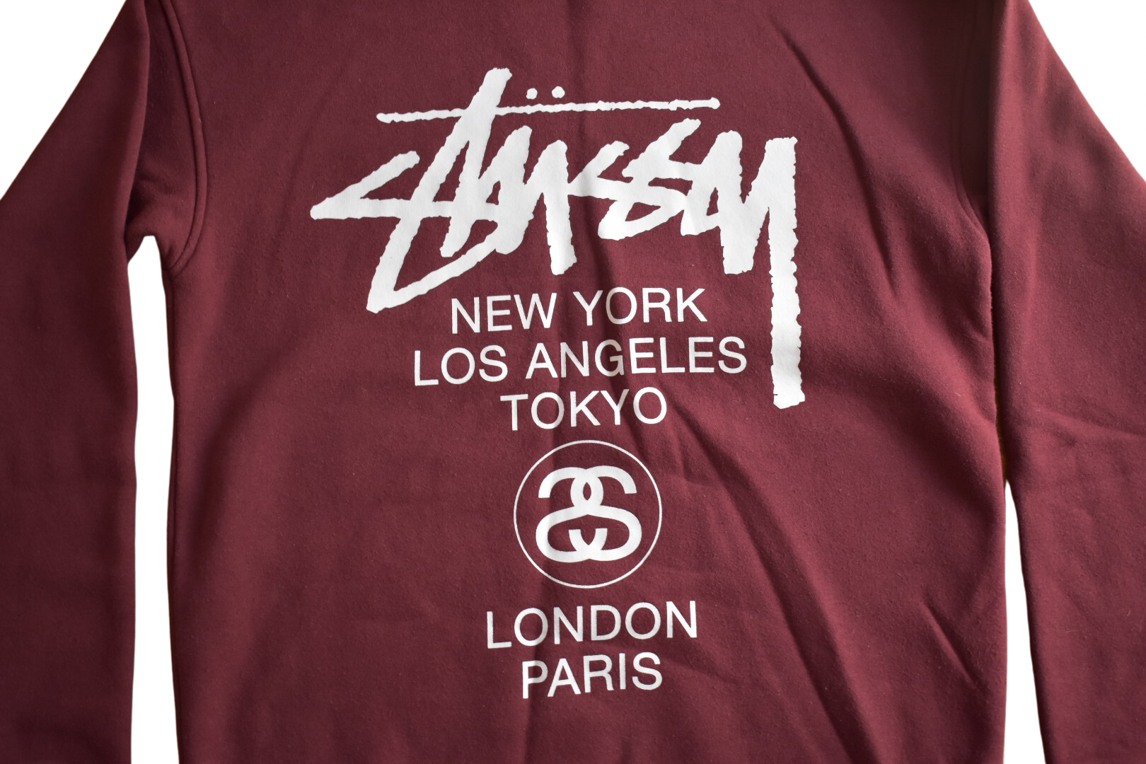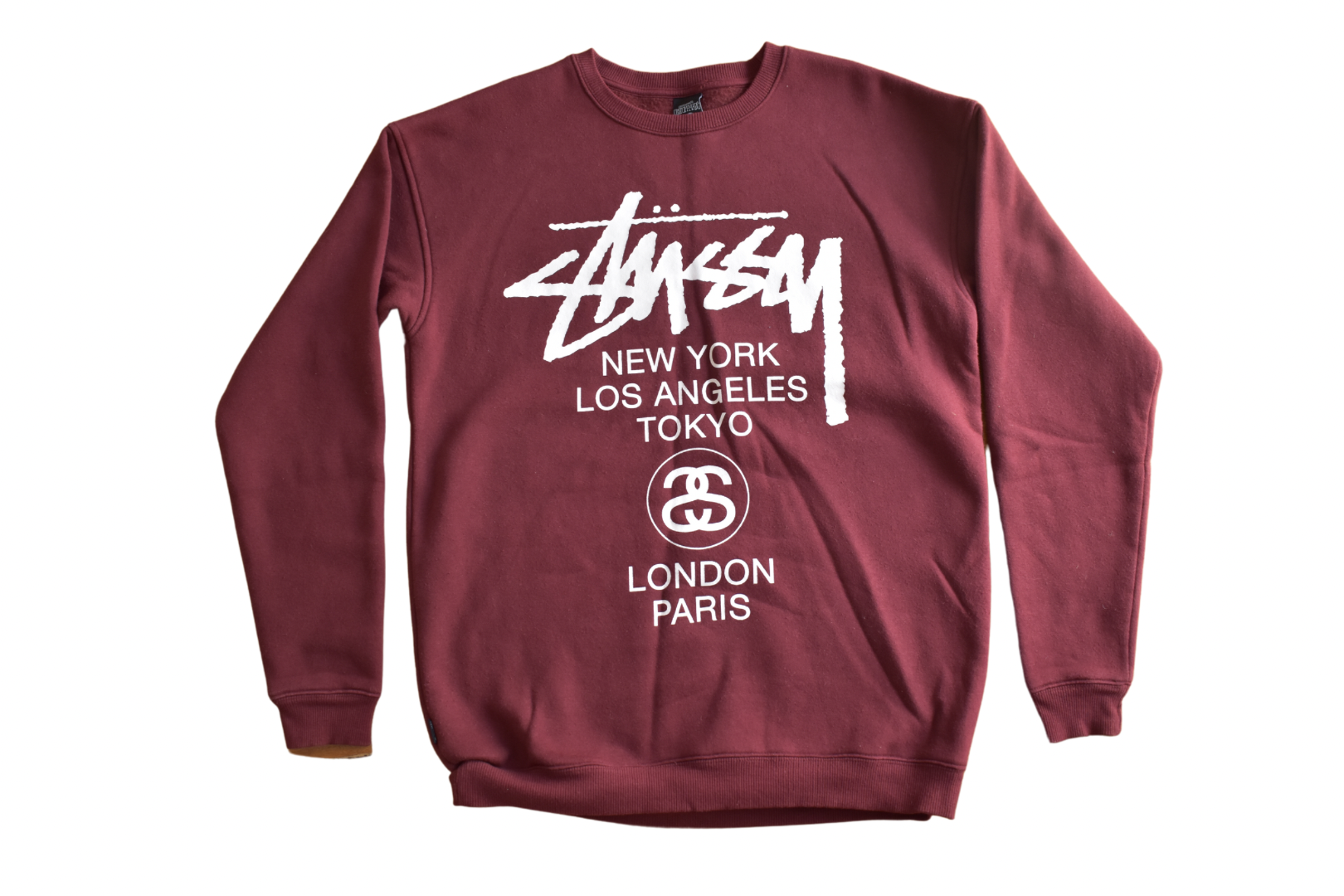 The retro crew neck jumper features "Stussy" emblem above "New York, LA, Tokyo, London, Paris". With a super soft interior, ribbed hemming and cuff sleeves, the retro-red vibe is perfect for hitting the streets or lounging around.